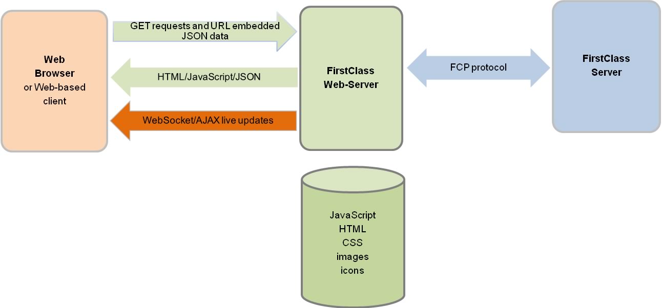 The FirstClass 12 API will use FirstClass Web Services (FCWS) which facilitates access to secure FirstClass Server data and functionality for any web-based client using HTML 5. Requests issued to FCWS are translated and securely sent to the FirstClass server for processing. The FirstClass Server responses are processed by FCWS and subsequently sent back to the web client.