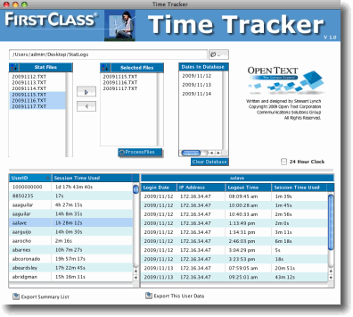 The FirstClass Time Tracker application asks you to load your Statistics files and then summarizes all logins for all users over the analyzed period.