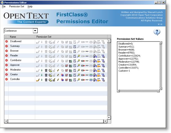 If you are not satisfied with the standard set of permissions that are in the FirstClass Client, you can modify them to meet your own needs. This application will assist you in that process. |